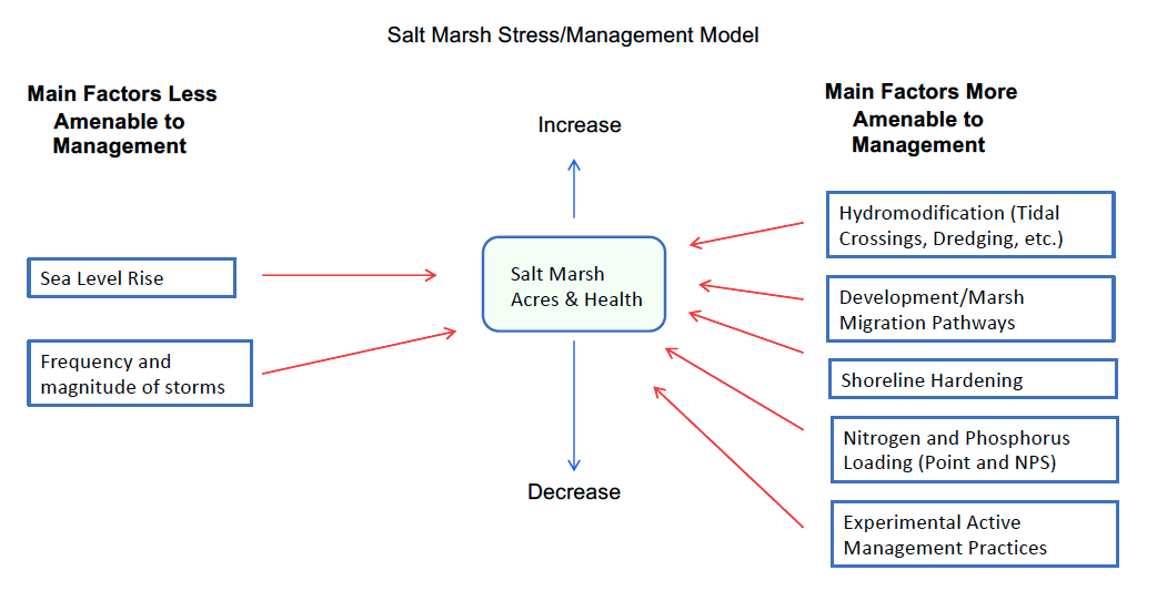 In order to meet the desired timeline, the RAMP will address the most critical issues facing the estuaries, but not necessarily all the ecosystem components. The five focus areas are: shellfish, eelgrass, salt marsh, fish, and humans. “Humans” will focus on the consumption of fish and shellfish as well as concerns regarding recreational water contact. “Shellfish” will focus on oysters and clams. Other important species such as lobsters and horseshoe crabs will be addressed in future revisions.