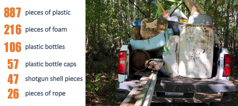 Debris ranged in size from large tires embedded in marsh, barrels, large pieces of foam, wood, and fishing gear to the smaller items like bottle caps, straws, forks, balls, and bags.